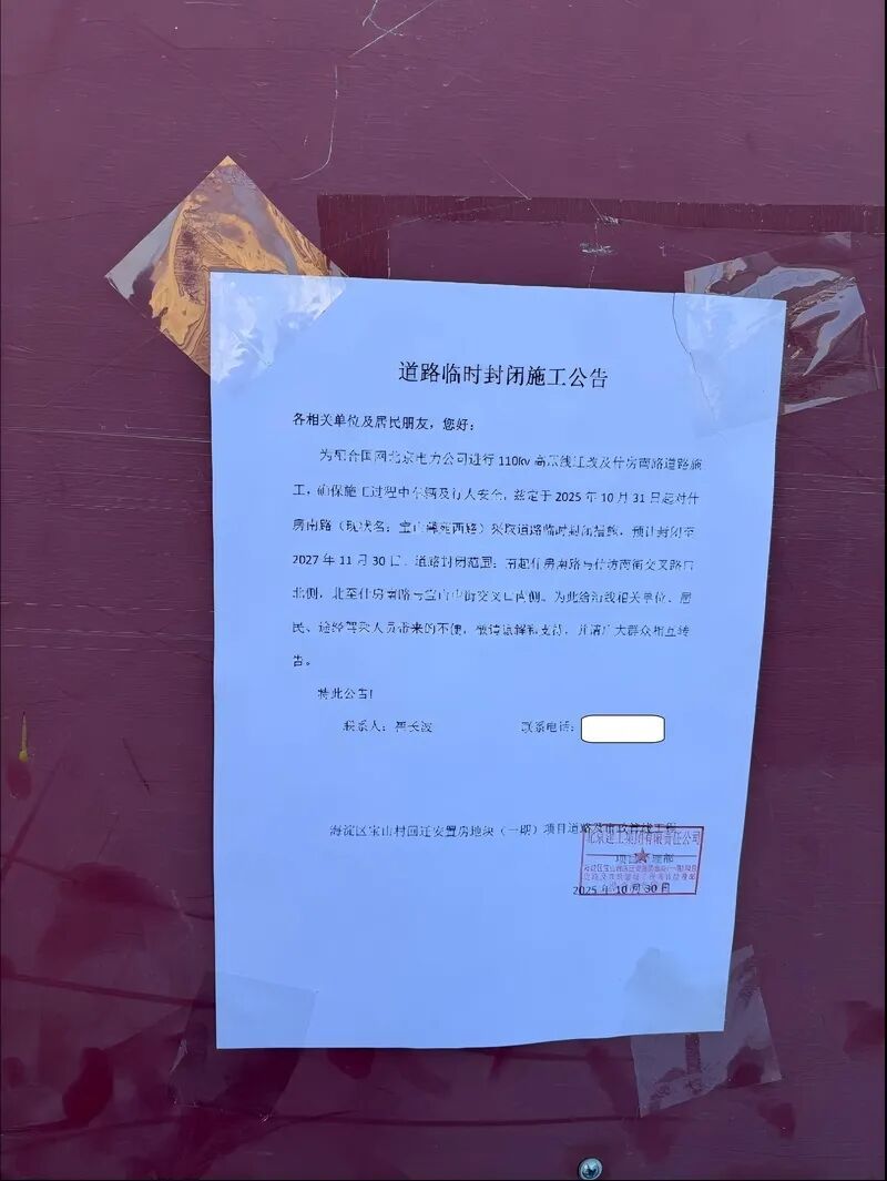 公告显示,道路封闭的原因是由于东侧回迁安置房项目需要进行道路管线施工,为确保施工安全,才进行临时封闭。如今安置房项目已基本完成,道路什么时候能恢复通行呢?带着市民疑问,记者与道路建设方北京鑫泰世纪置业投资有限公司取得联系。对方表示,影响施工进展的主要原因是道路上方有110kv高压线,同时道路中间有一座高压线塔。需对整体进行挪移后,才能进行道路拓宽建设。同时在去年10月30日,现场还张贴了第二次公告,告知封闭时间为2025年10月31日到2027年11月30日。工作人员李锋表示,目前已加快前期工作进展,力争早日实现道路通车。